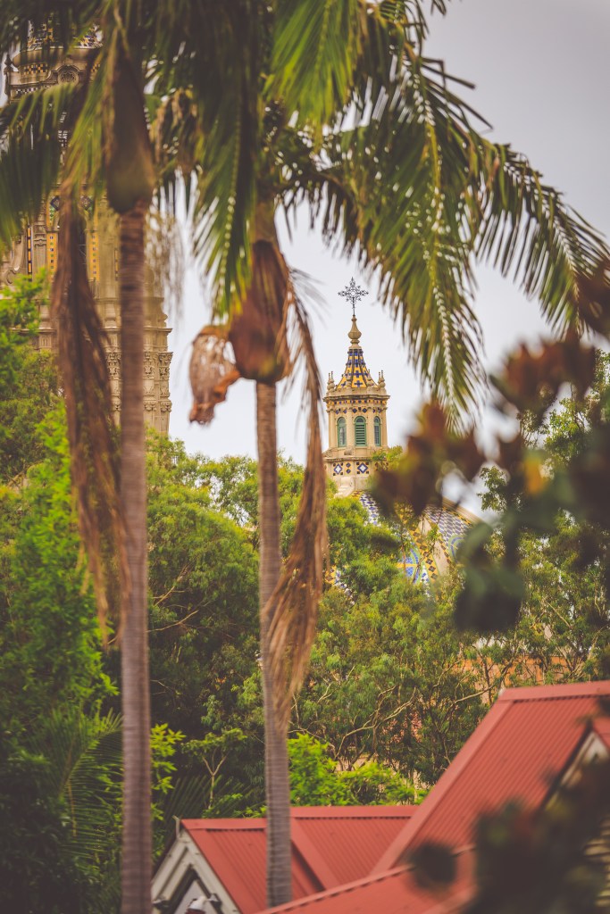 The California Building, with its ornate facade and blue-and-gold dome, is seen through the trees from the 450-foot Bashor Bridge inside the San Diego Zoo.
