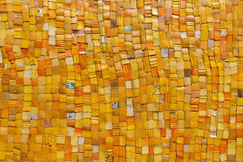 Serge Attukwei Clottey’s massive installation was created using woven pieces of recycled yellow plastic Kufuor gallons once used to transport water in Ghana.