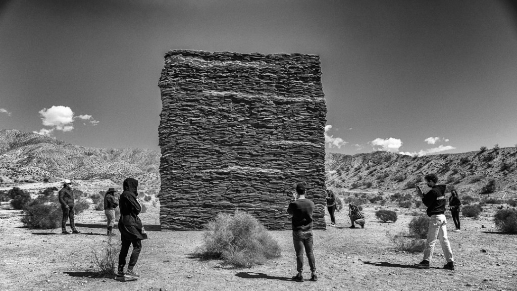 Zahrah Alghamdi’s monolithic wall is comprised of stacked forms impregnated with cements, soils, and dyes specific to the California Desert region.